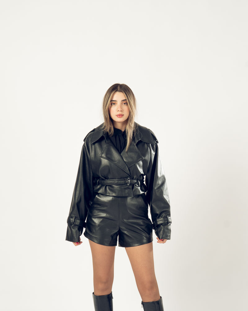 This Faux Leather Trench Jacket brings a refined, structured silhouette with a modern edge. Slightly relaxed through the body, it drapes smoothly while maintaining a polished, elevated look perfect for everyday wear or evening styling.
