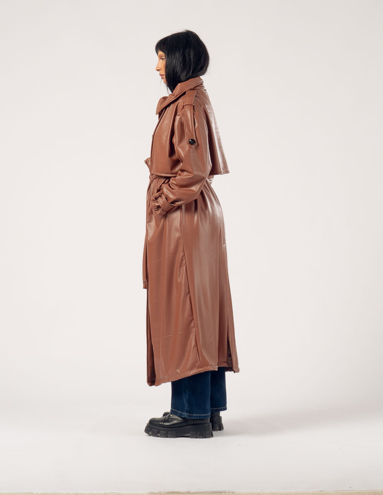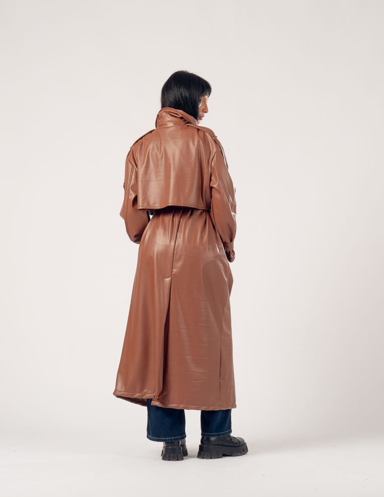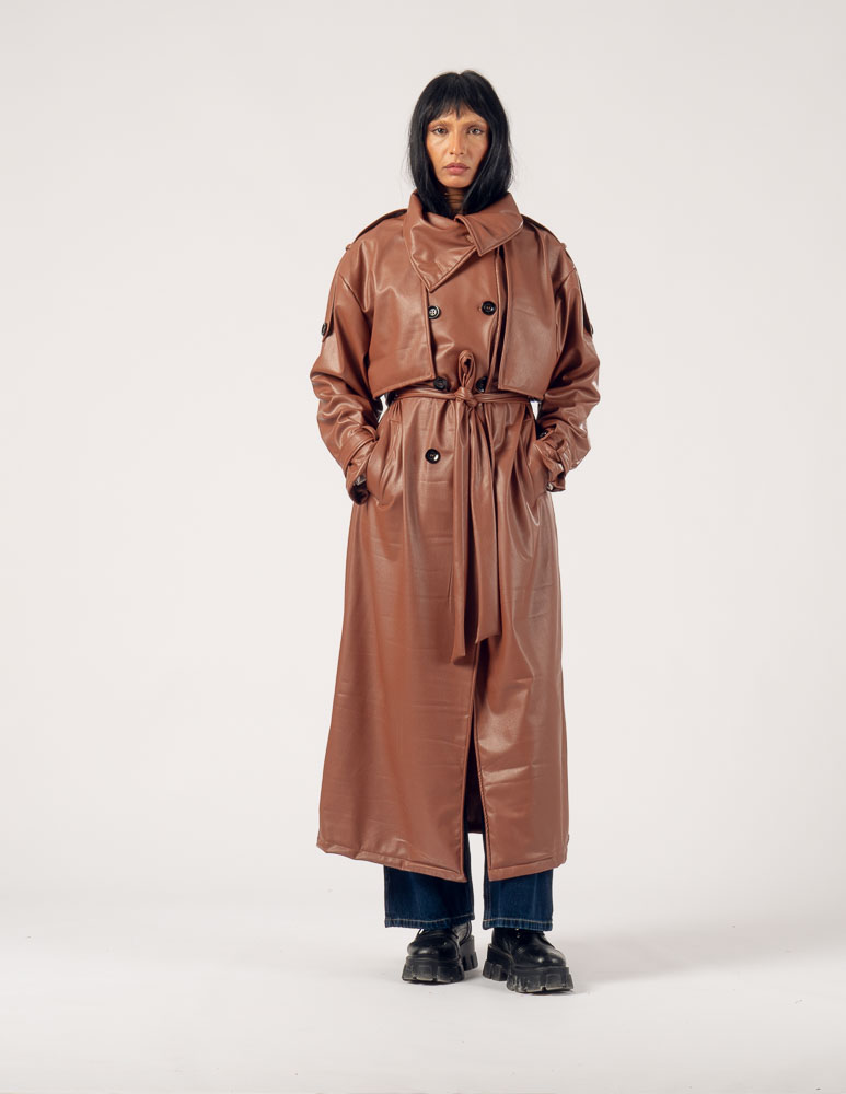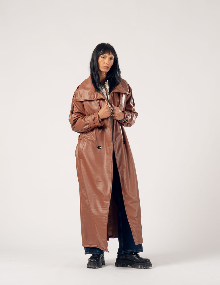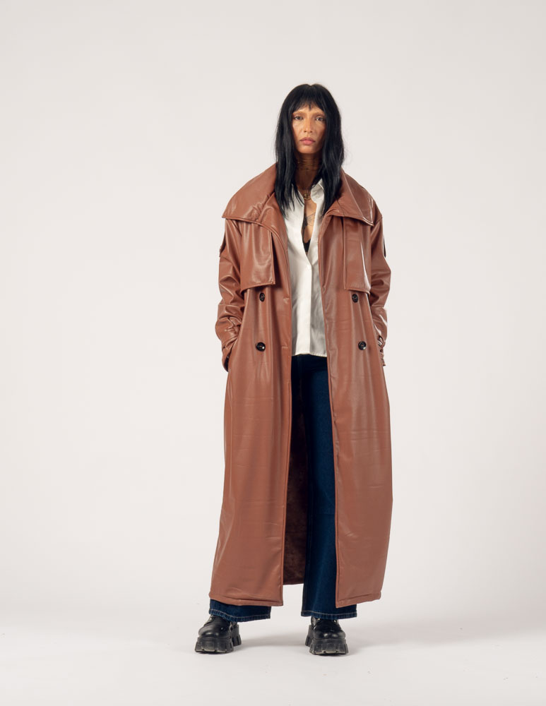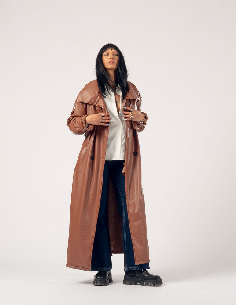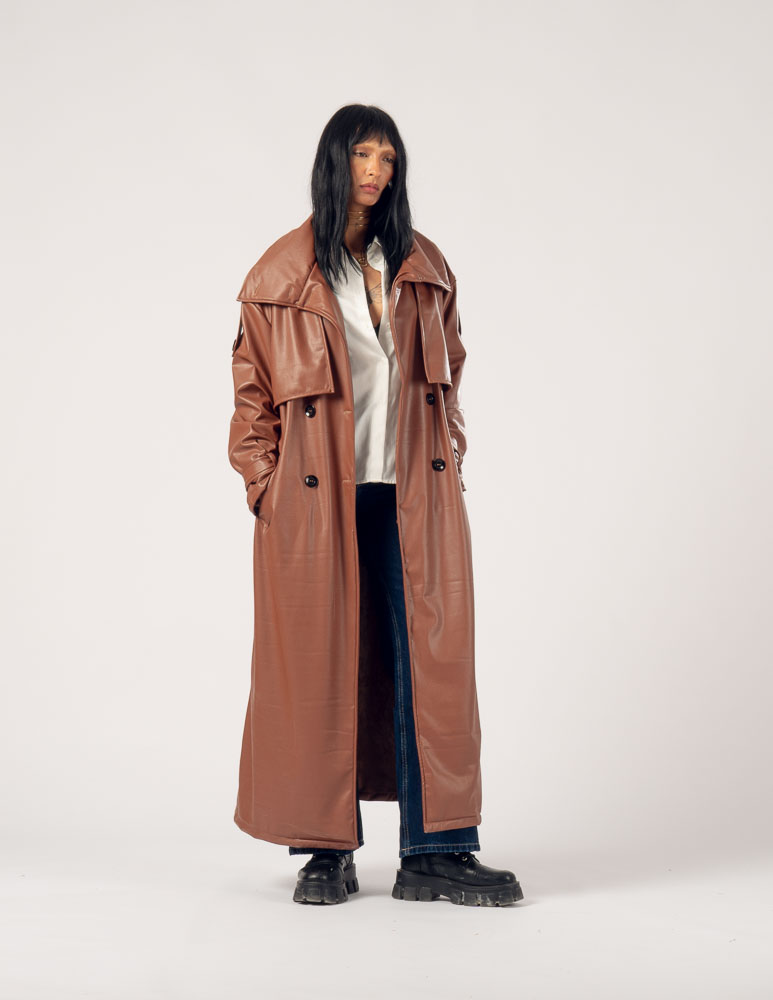 The Highline Leather Trench Coat features a structured high neck and a slightly oversized silhouette, offering a bold yet elegant statement. It drapes smoothly over the body, combining edgy sophistication with comfort, making it perfect for transitional weather or refined layering.
