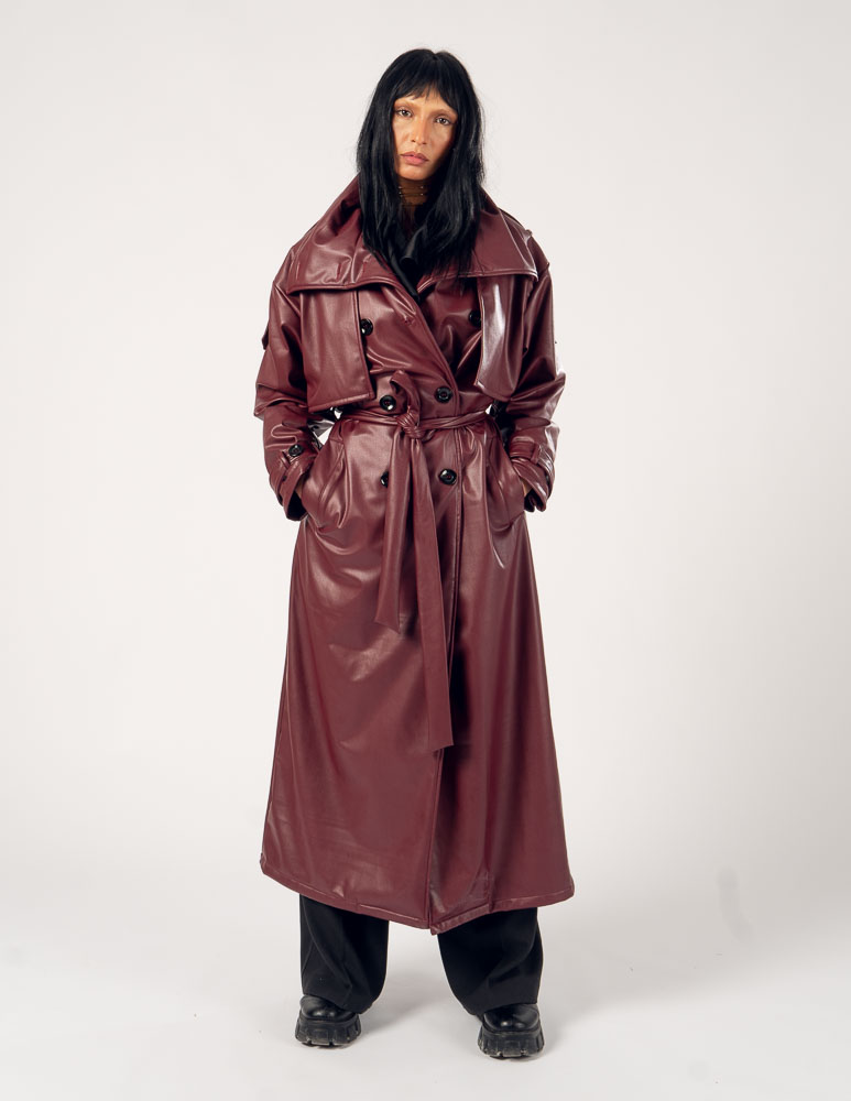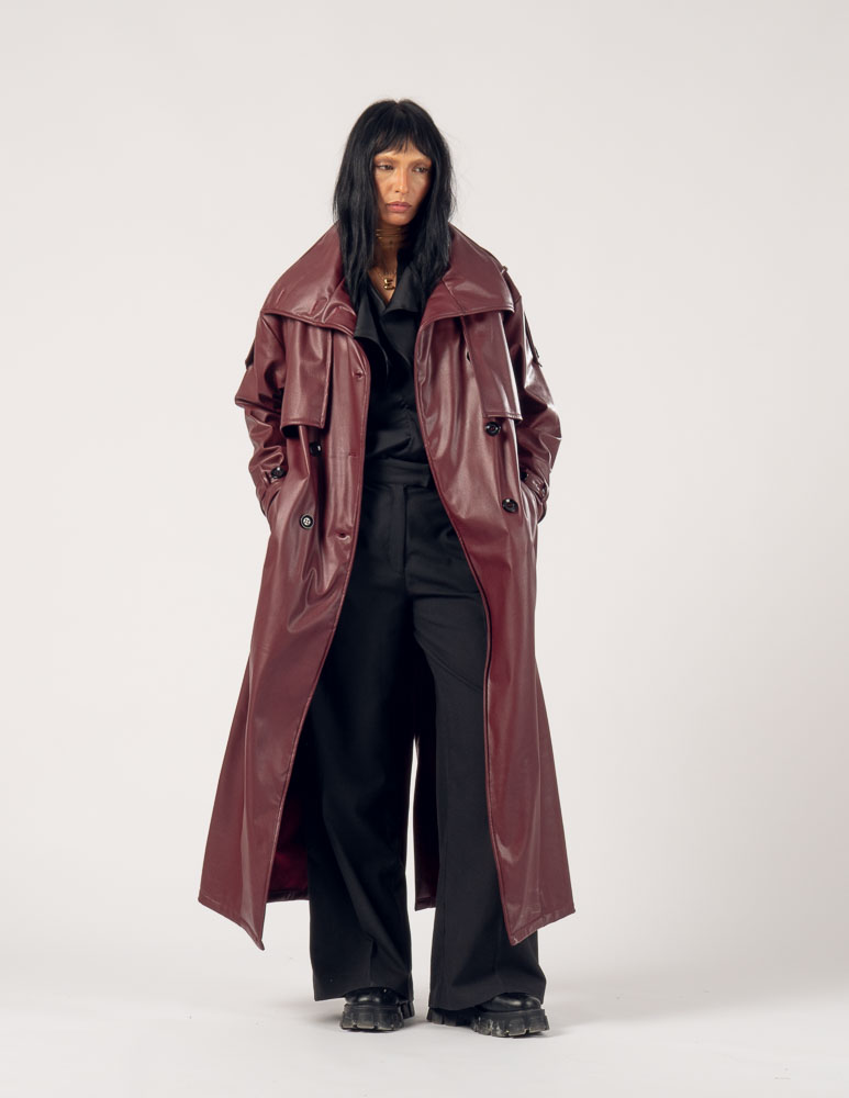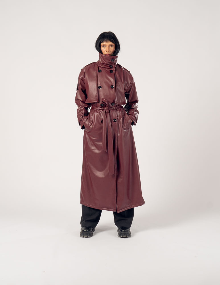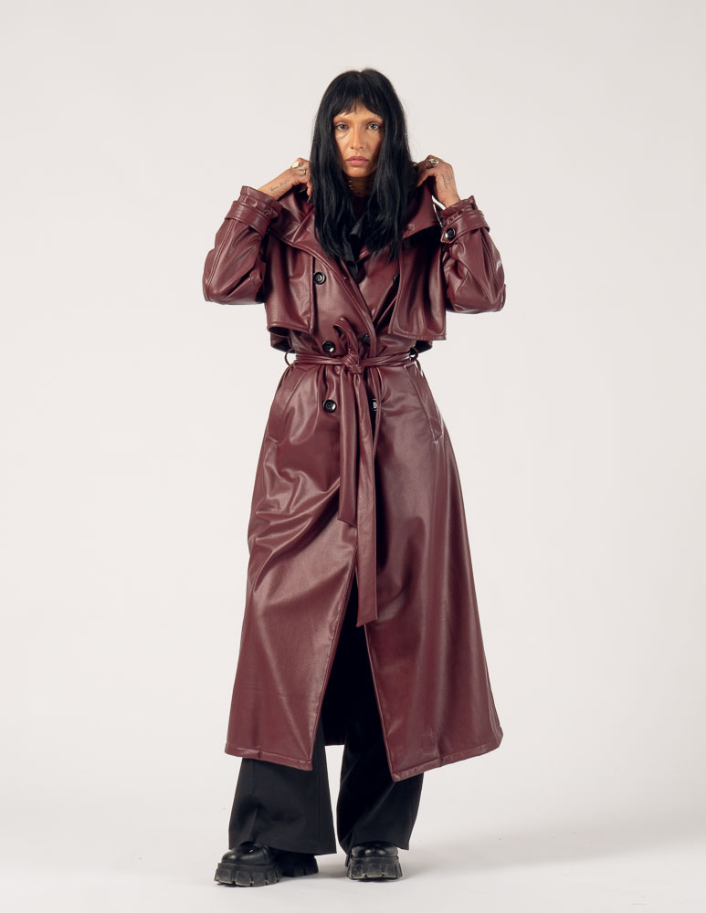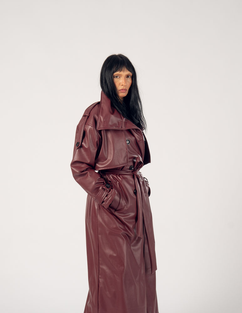The Highline Leather Trench Coat features a structured high neck and a slightly oversized silhouette, offering a bold yet elegant statement. It drapes smoothly over the body, combining edgy sophistication with comfort, making it perfect for transitional weather or refined layering.