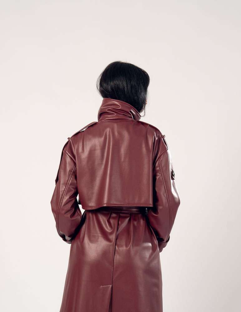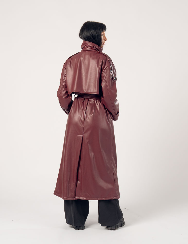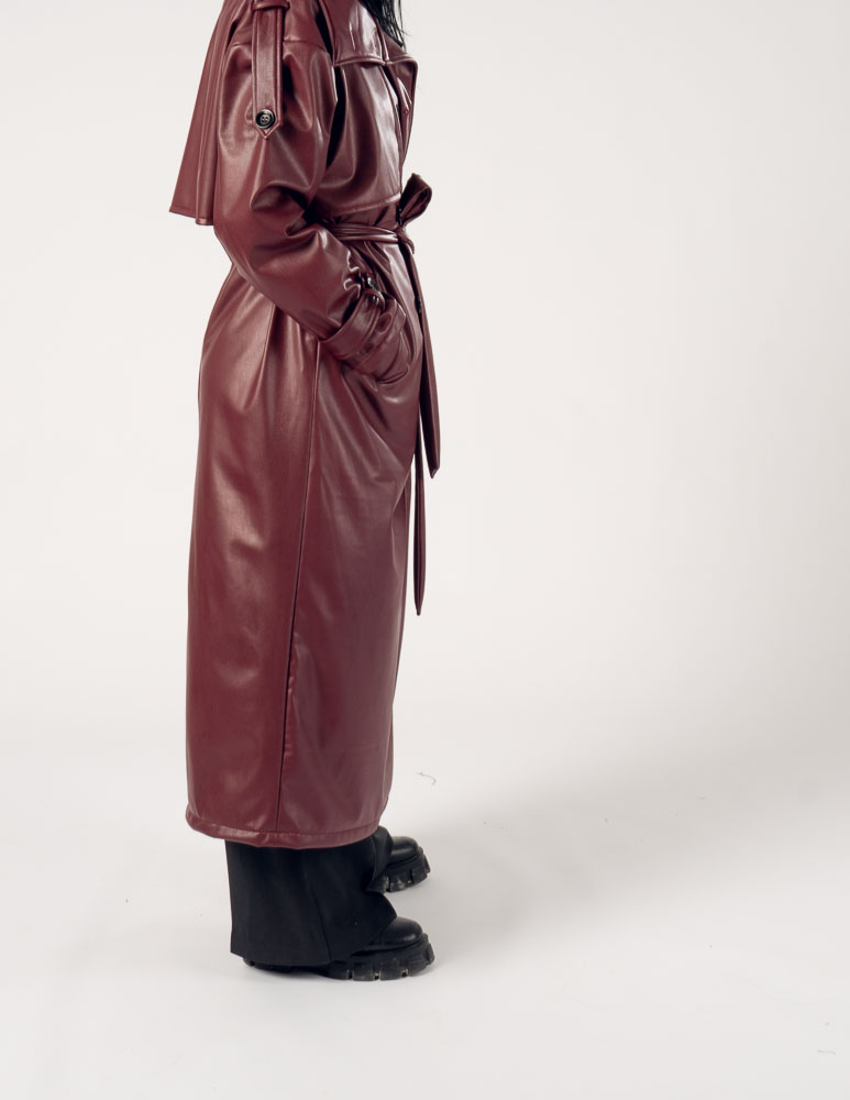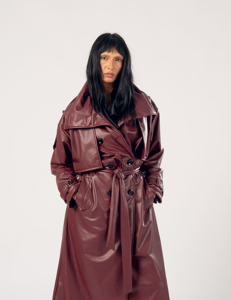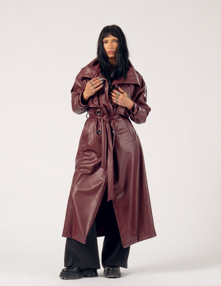 The Highline Leather Trench Coat features a structured high neck and a slightly oversized silhouette, offering a bold yet elegant statement. It drapes smoothly over the body, combining edgy sophistication with comfort, making it perfect for transitional weather or refined layering.