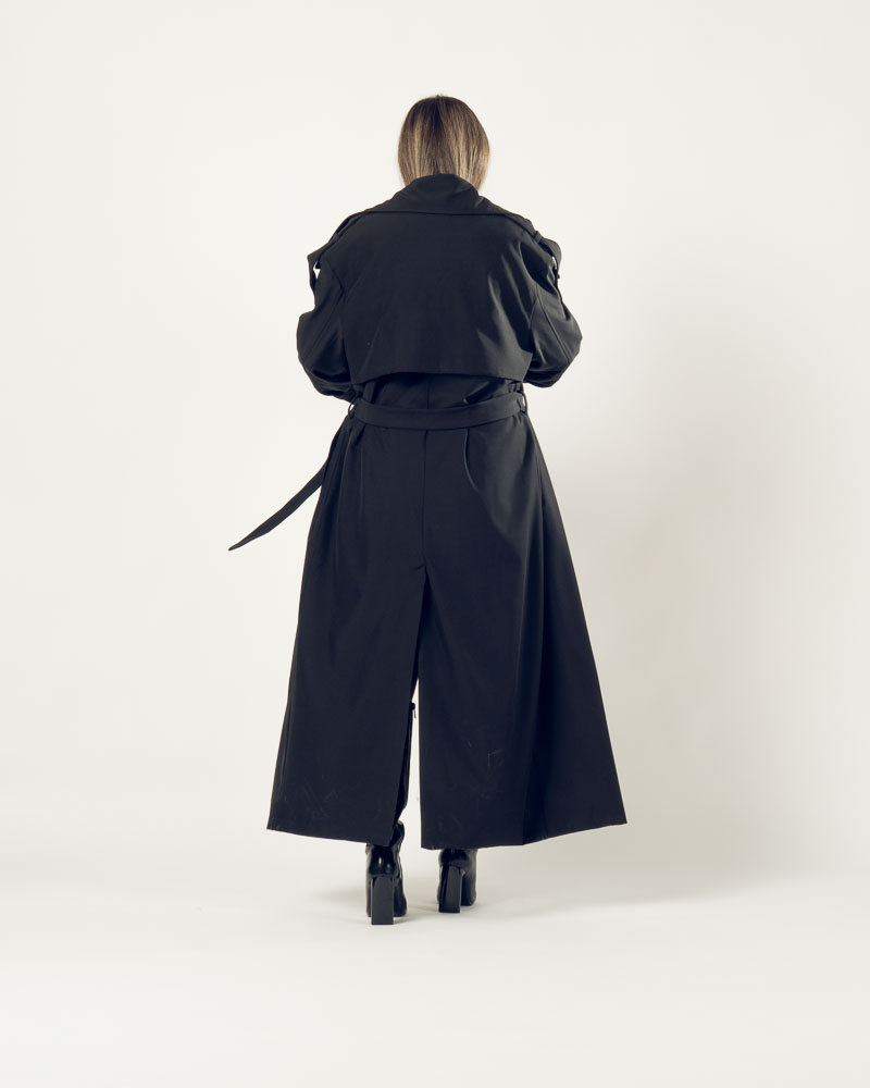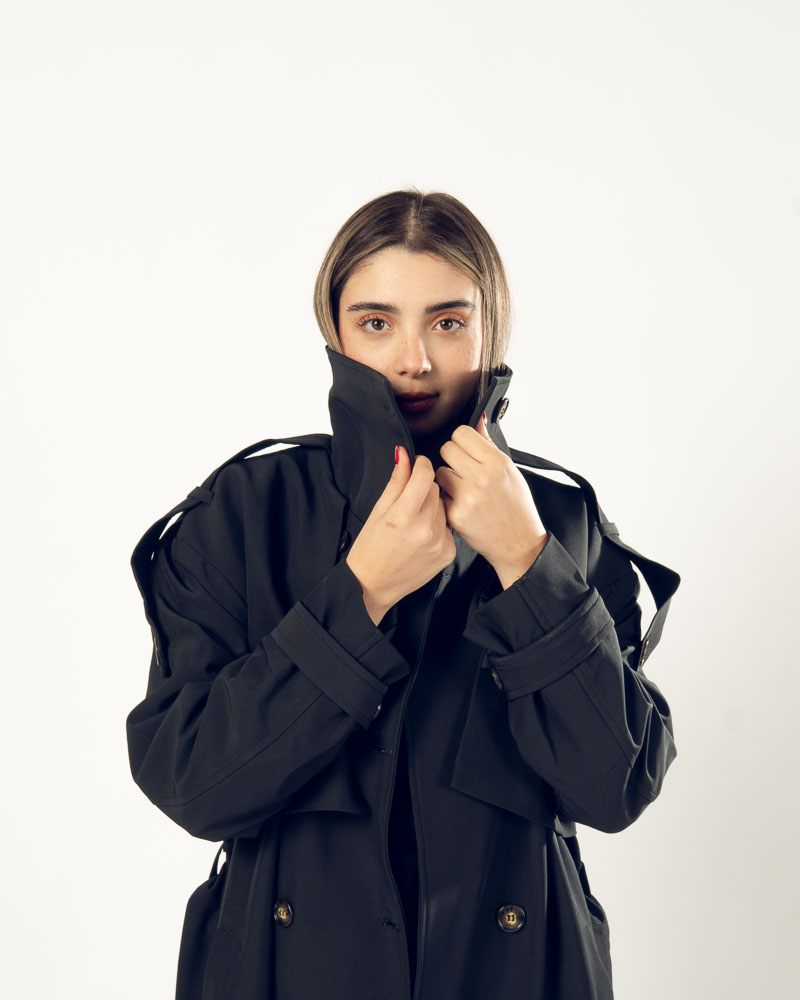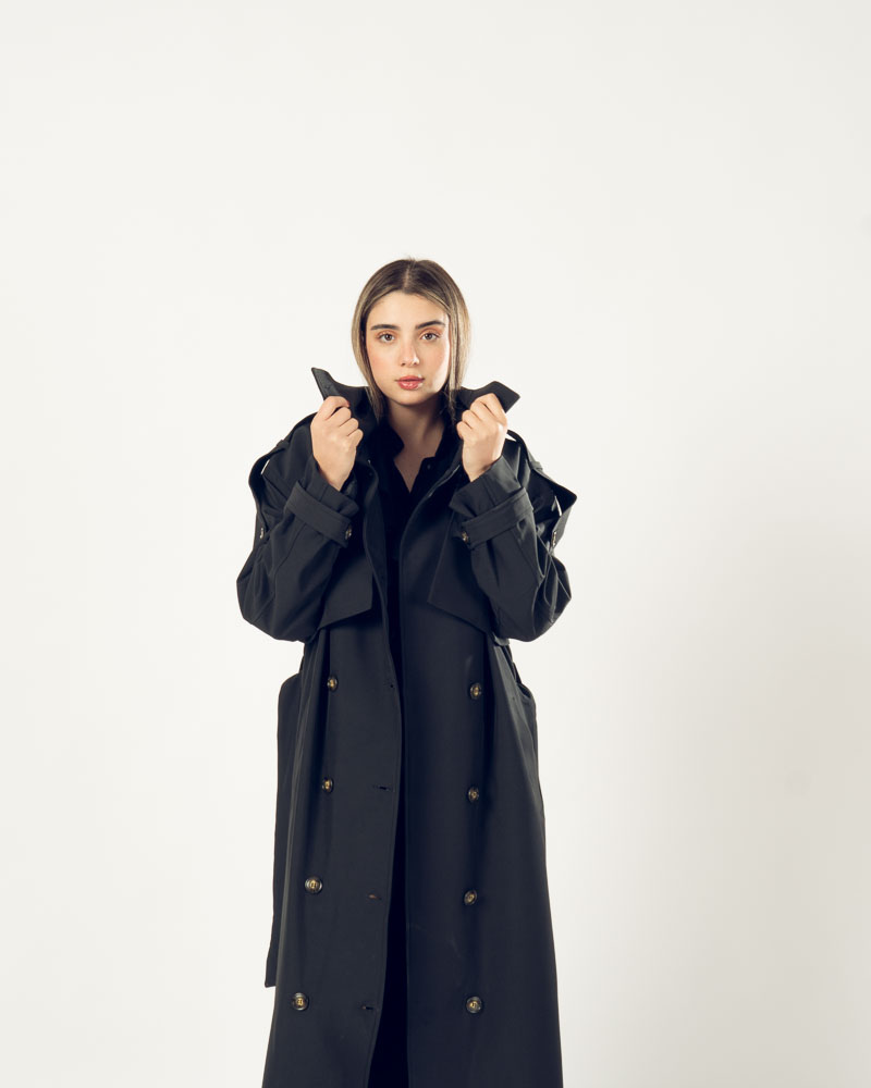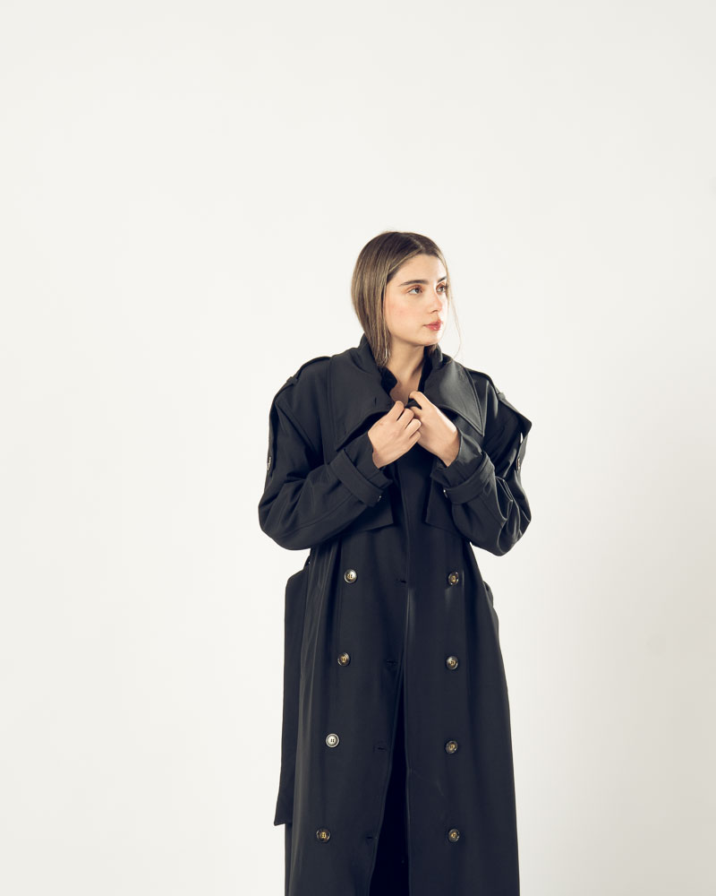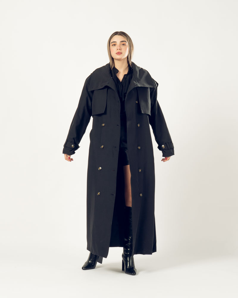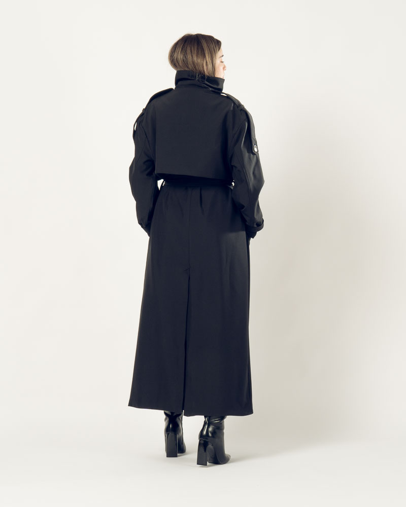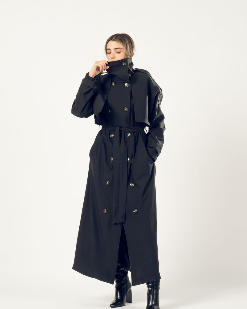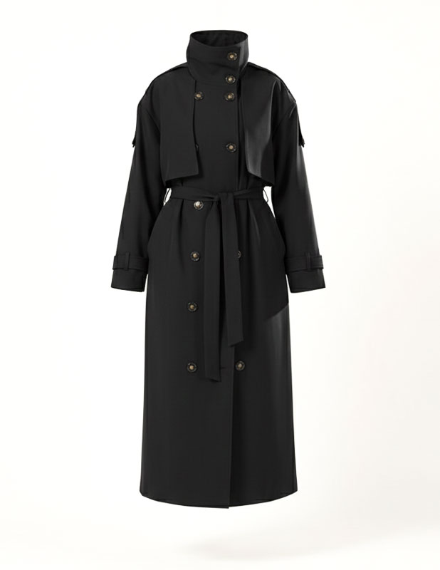 The Highline Trench Coat features a refined high neckline and a slightly oversized form that delivers elegance with a modern twist. Designed for movement and comfort, it drapes beautifully while maintaining a clean, structured look.