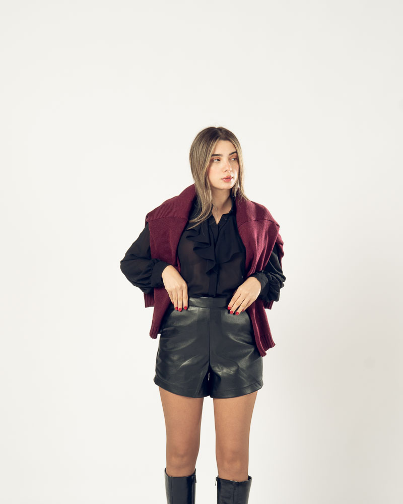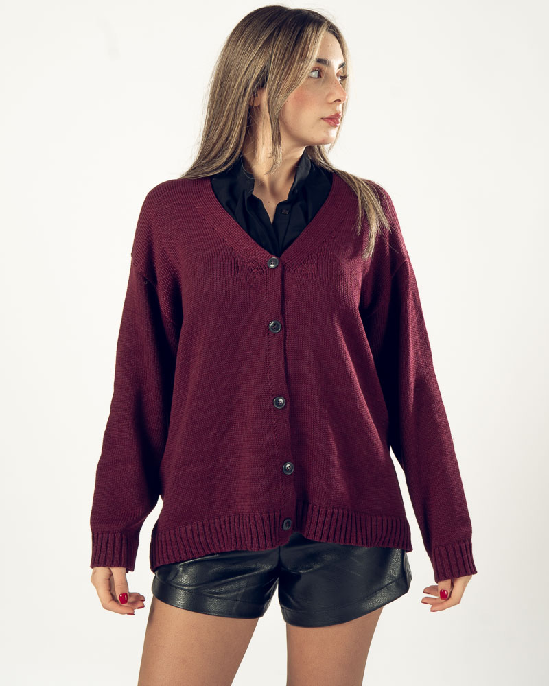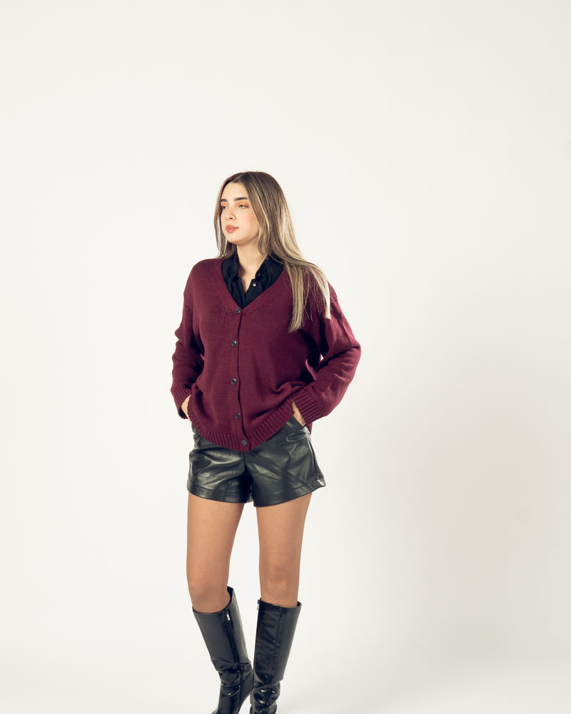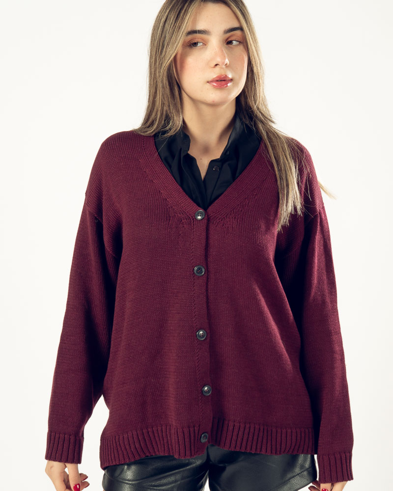 At 165 cm, the model wears size S/M. The cardigan falls elegantly on the hips, providing a relaxed, modern look without overwhelming the frame.
