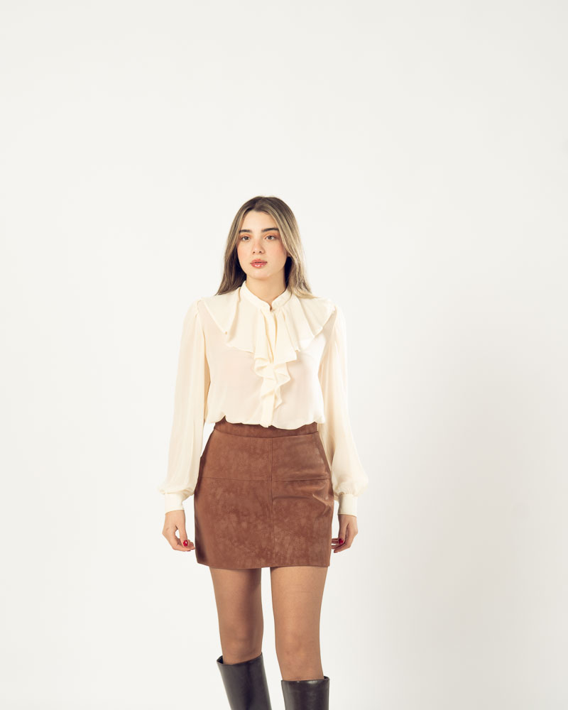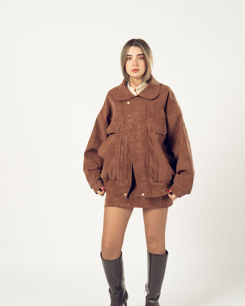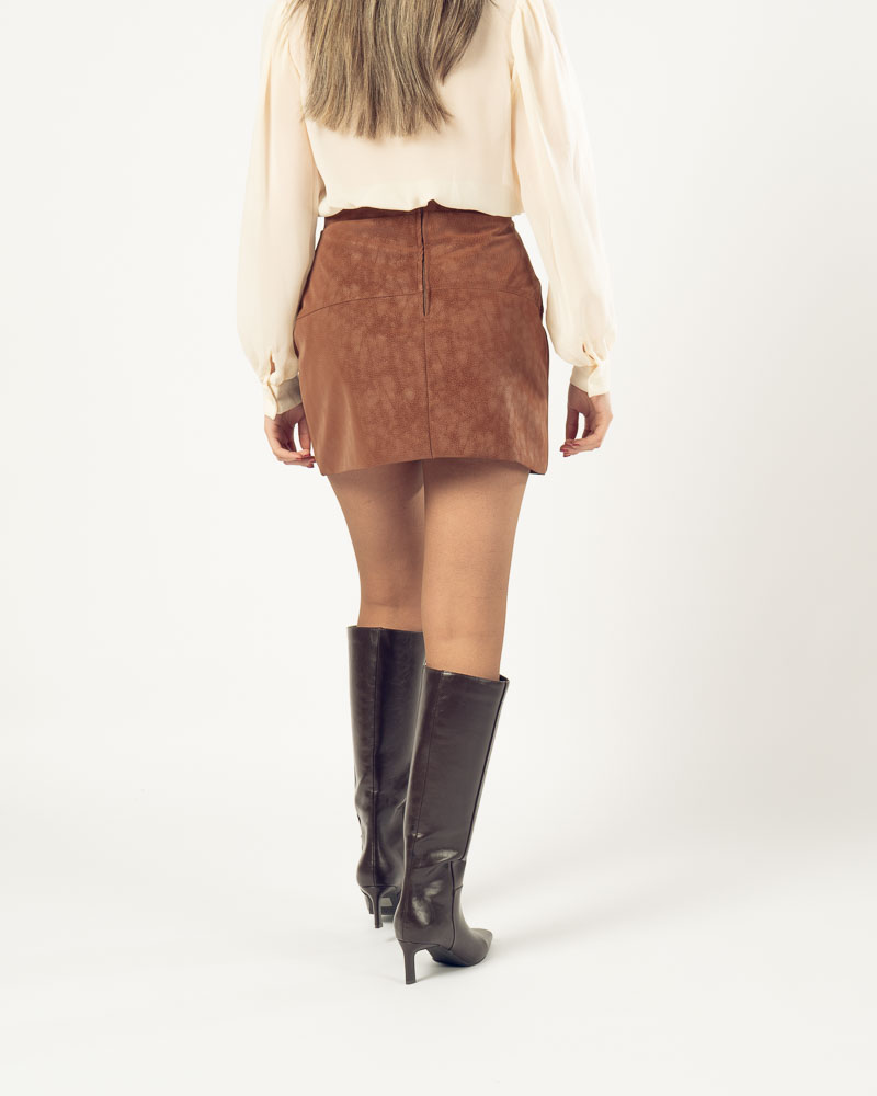 The Faux Leather Mini Skirt offers a sleek, structured silhouette with a modern finish. It sits comfortably at the waist and maintains its shape, creating a chic, flattering line that pairs effortlessly with both casual and dressy looks.