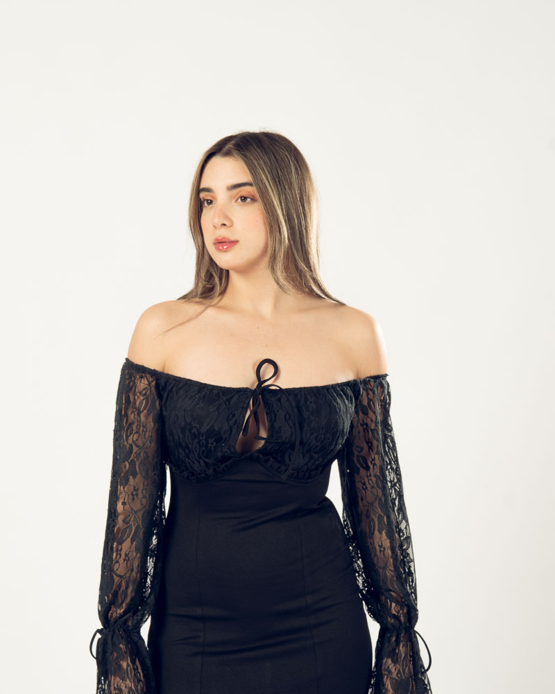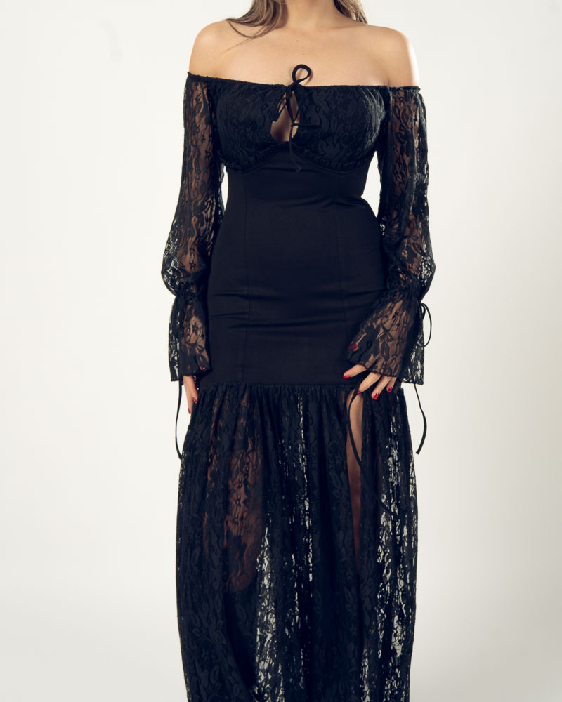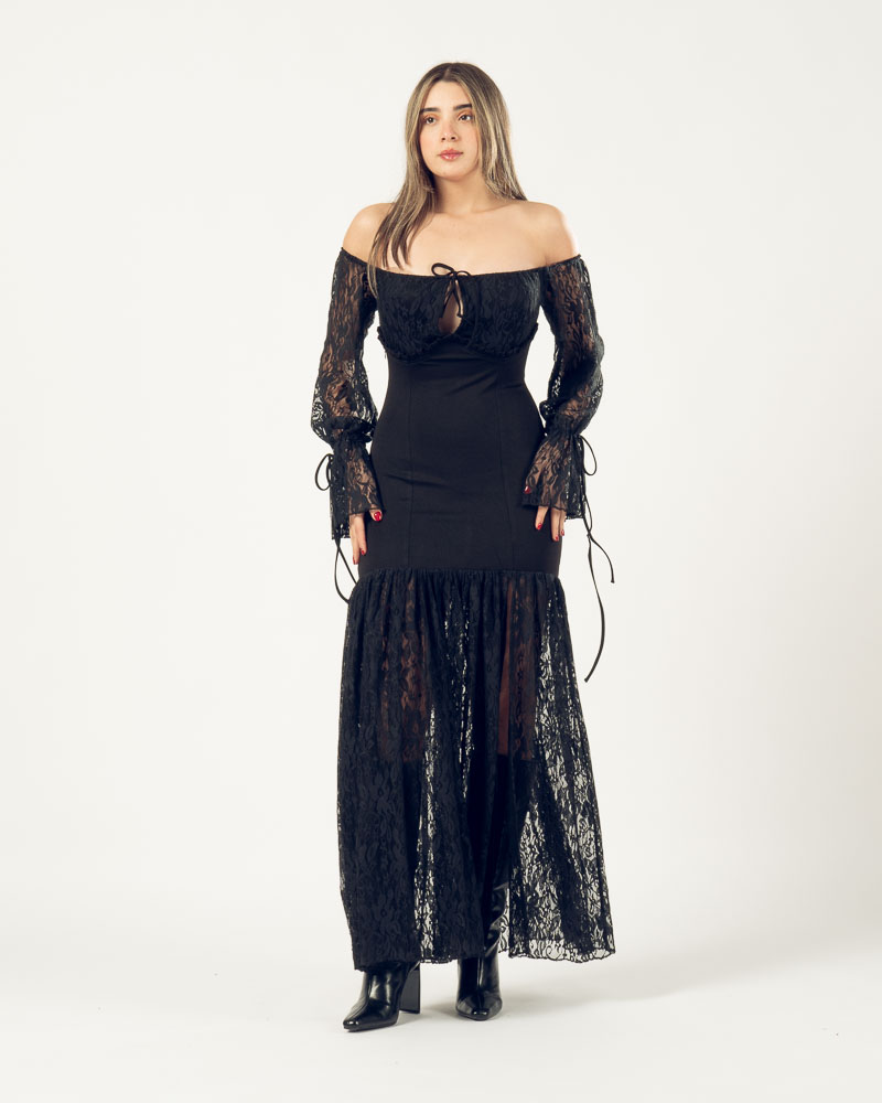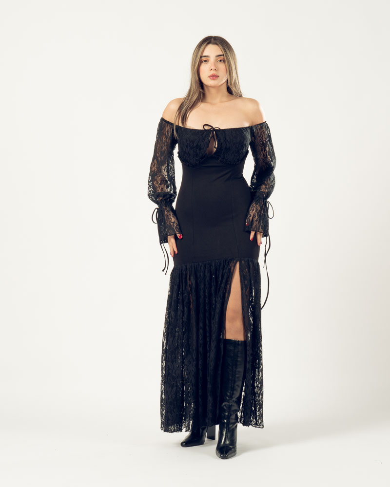 The Moonlight Dress is a luxurious maxi dress designed for New Year celebrations. Delicate lace trims on the sleeves and hemline add elegance, while the flowing skirt creates a graceful, feminine silhouette. Its fitted bodice enhances the waist, balancing sophistication with movement.