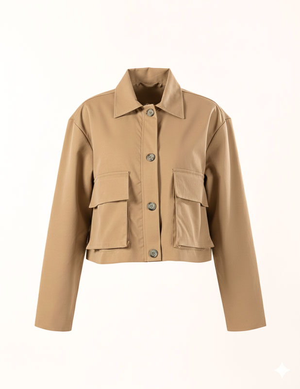The Cropped Worker Jacket blends utility with a modern, feminine edge. Featuring a structured silhouette with functional pockets and a slightly boxy cut, it delivers both practicality and style. The cropped length flatters the waist and pairs perfectly with high-rise pants or skirts, creating a balanced, contemporary look.