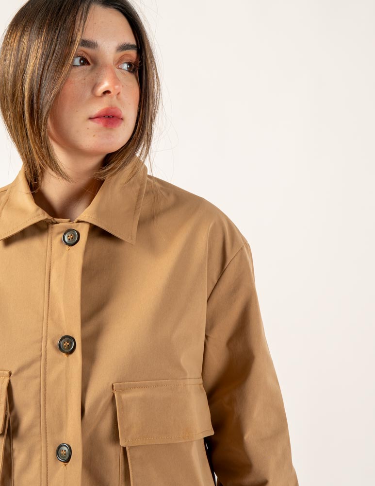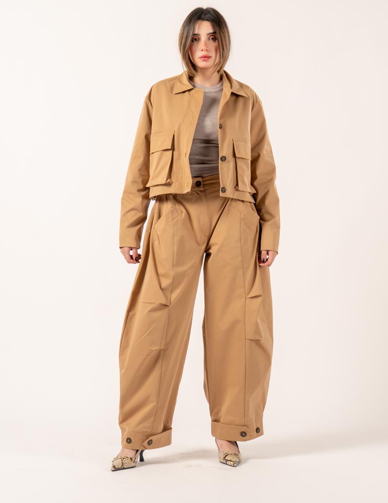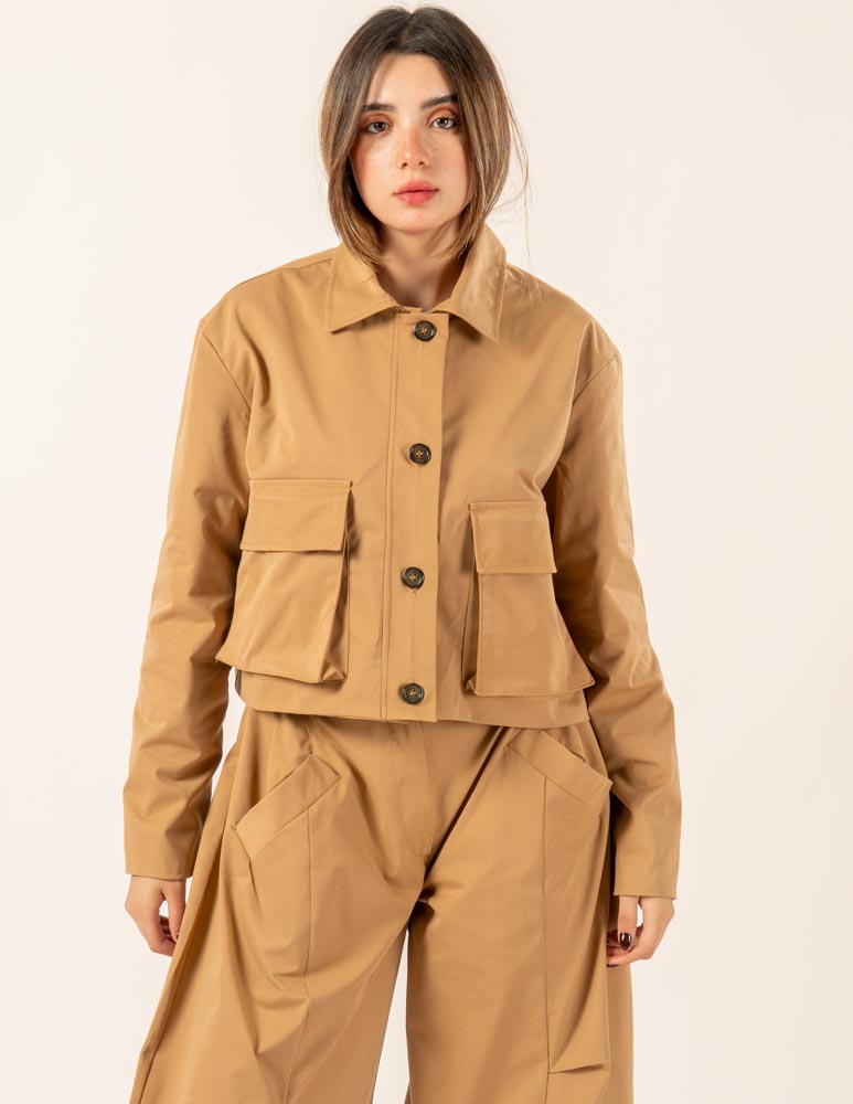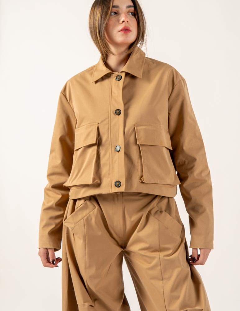 The Cropped Worker Jacket blends utility with a modern, feminine edge. Featuring a structured silhouette with functional pockets and a slightly boxy cut, it delivers both practicality and style. The cropped length flatters the waist and pairs perfectly with high-rise pants or skirts, creating a balanced, contemporary look.